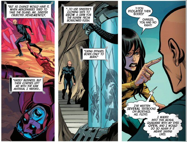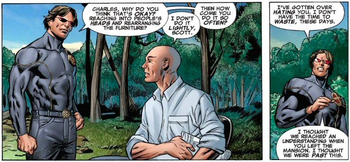 Charles is worried that Sinister has left controls behind in various people, including Scott. After immobilizing Scott against his will and preventing him from leaving, his former pupil is none too pleased:
