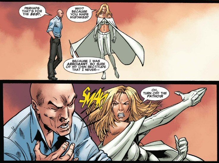 Emma has been inconsistently written over the years, but her disdain for Charles’ methods and approach has always been clear. This moment is purportedly to show that even Emma wishes him well – as he has “earned it” – which feels completely unearned to me. Looking online, I see that even comic fans who don’t like Emma’s character feel bad about seeing her written this way! I will come back to an alternate way this could have gone at the end of this post.