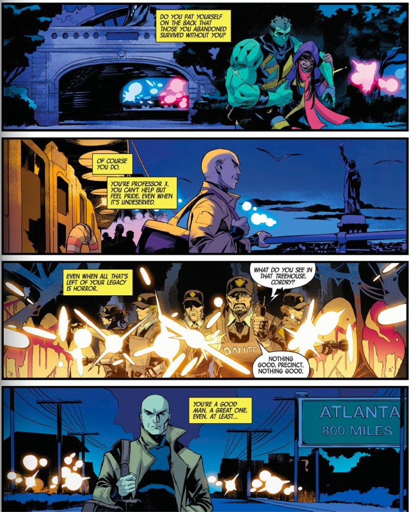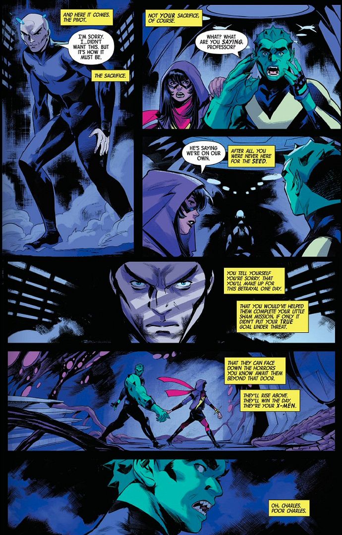 Charles attempts to manipulate the NYX mutants to help him in his supposed quest. Of course, he lies to them about his true intentions. And in the process puts the young mutants Ms. Marvel and Anole in grave peril when he eventually betrays them – as he had always planned to do: