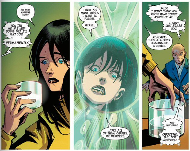 This comic series had established Sally as an alcoholic. And so, she asks Charles to not only erase her knowledge of events (for a fourth time), but also her whole personality as well this time (!). And Charles agrees, adding a block so that she doesn’t drink any more. “Obscene” indeed! This is extremely offensive, given that Charles is responsible for having left the clue she found in the first place.