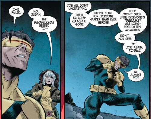 Charles is at a loss for an answer at first, but eventually settles on “motive” as his defense – he did it all for the sake of the “dream”. Recall that the original framing for Charles was more deontological in the very early X-Men. But Scott then gives him a lecture on how it was morally wrong for him to have created his children’s army in service of that dream.