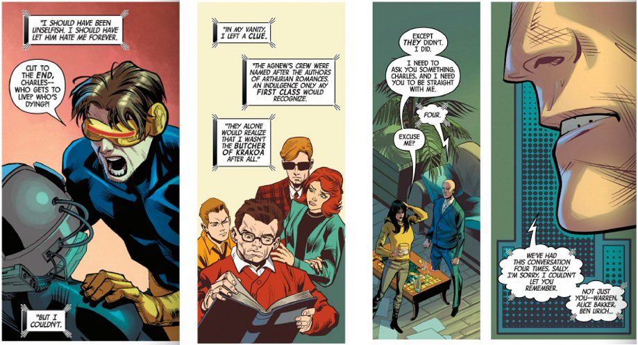 Similarly, as indicated above Warren (aka Angel) is getting his mind and memories interfered with by Charles currently – at the risk of permanent brain damage, it is revealed here – to stop him from finding out the truth. So this retcon demands that we accept that Charles went out of his way to leave a clue that only four people would recognize, and then subsequently lied to and erased the awareness of it from two of those four people. This is not reasonable for a retcon in my view.