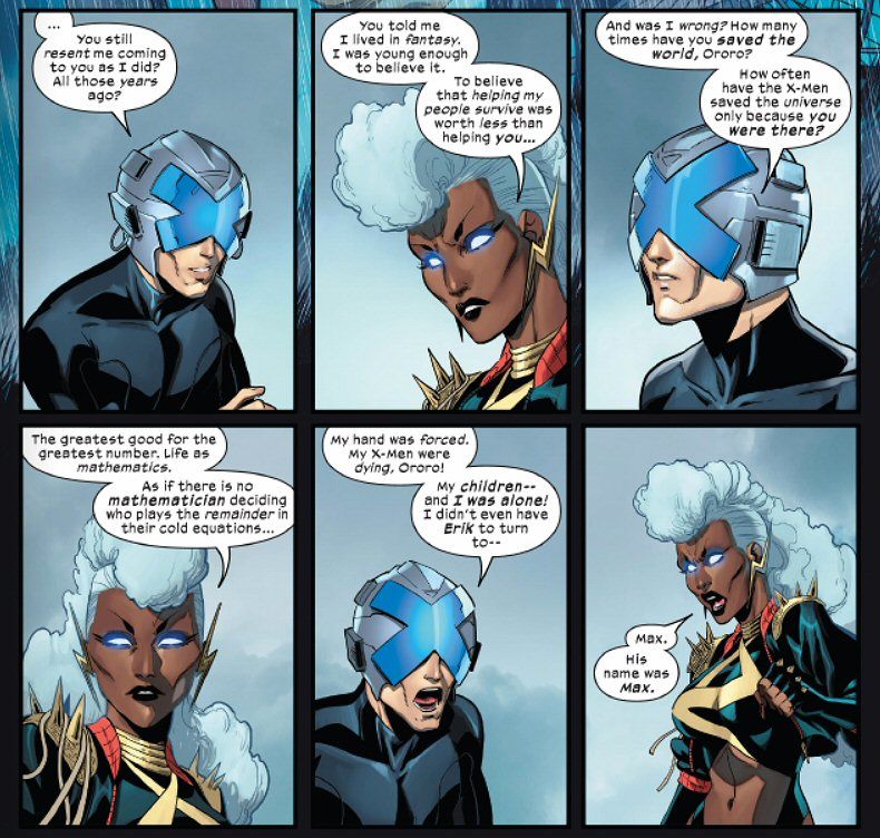 Instead, Williams argued that moral decisions must preserve our psychological identity and personal integrity. As such, we should reject any normative ethics theory that reduces moral decision making to an algorithm. Which brings me back to Charles Xavier, and Storm’s rebuke of his mathematical thinking, from X-Men: Red Vol 2, issue #11, 2022, by Al Ewing, Stefano Caselli and Jacopo Camagni: