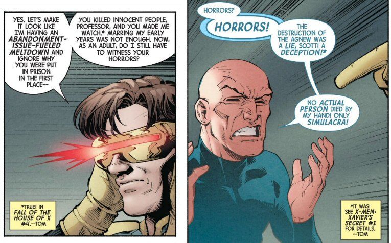 That’s an odd level of indignation from Charles, as he is the one who purposefully hid the deception from Cyclops and everyone else in the retconned story about the destruction of cloned humans on the Agnew (!). The editorial notes above from Tom Brevoort again suggest that the editorial team approved this oddly inconsistent retcon and story line.