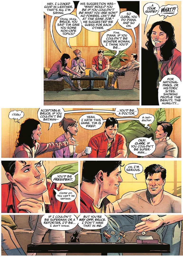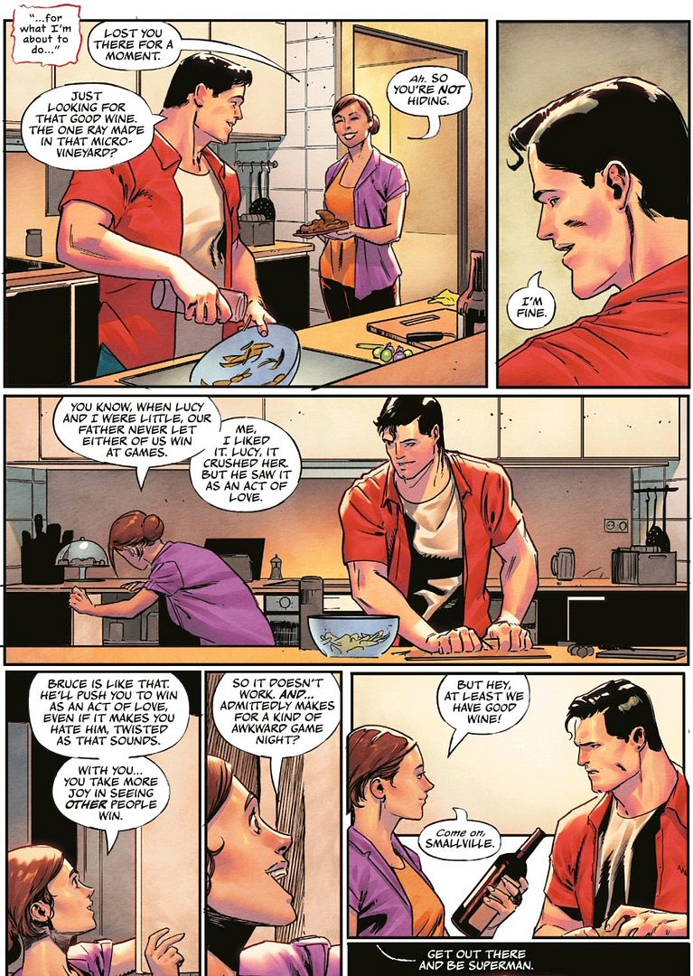 This “game night” party at Lois and Clark’s place is pivotal to understanding the ethics of the characters in the current time period – and these game night flashbacks are cleverly interwoven throughout the five-issue run of the DC K.O. event. These “interludes” were typically written by Williamson and drawn by Xermanico. Also from the first issue:
