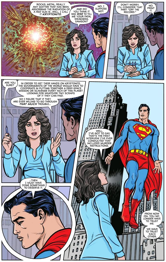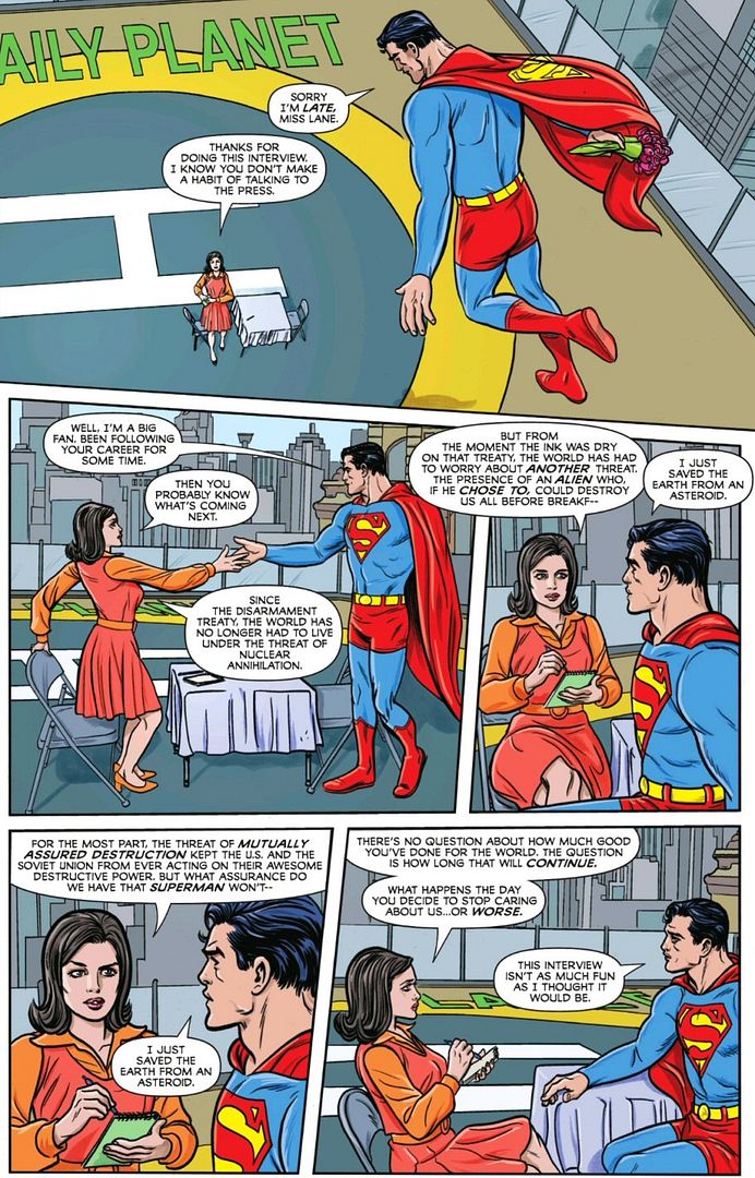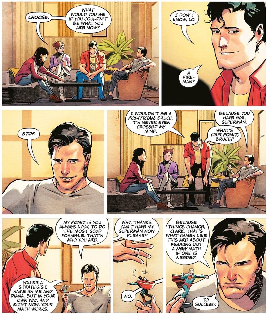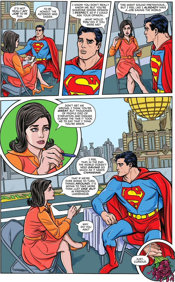 Interestingly, Lois is making the point here (much like Lex Luthor did in the recent DC K.O. event introduced above) that Superman is a risk to the world, and that the world needs changing not just saving. But unlike Lex, Lois is taking a modern perspective that acknowledges that changing the world takes concerted coordinated effort, not just one guy in a costume.