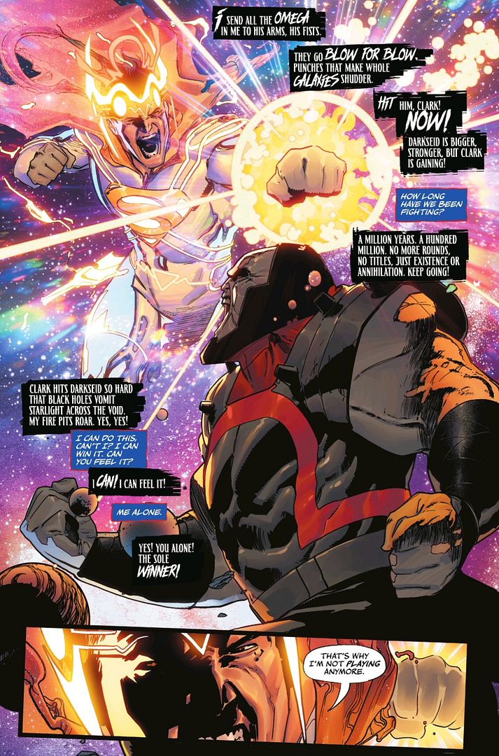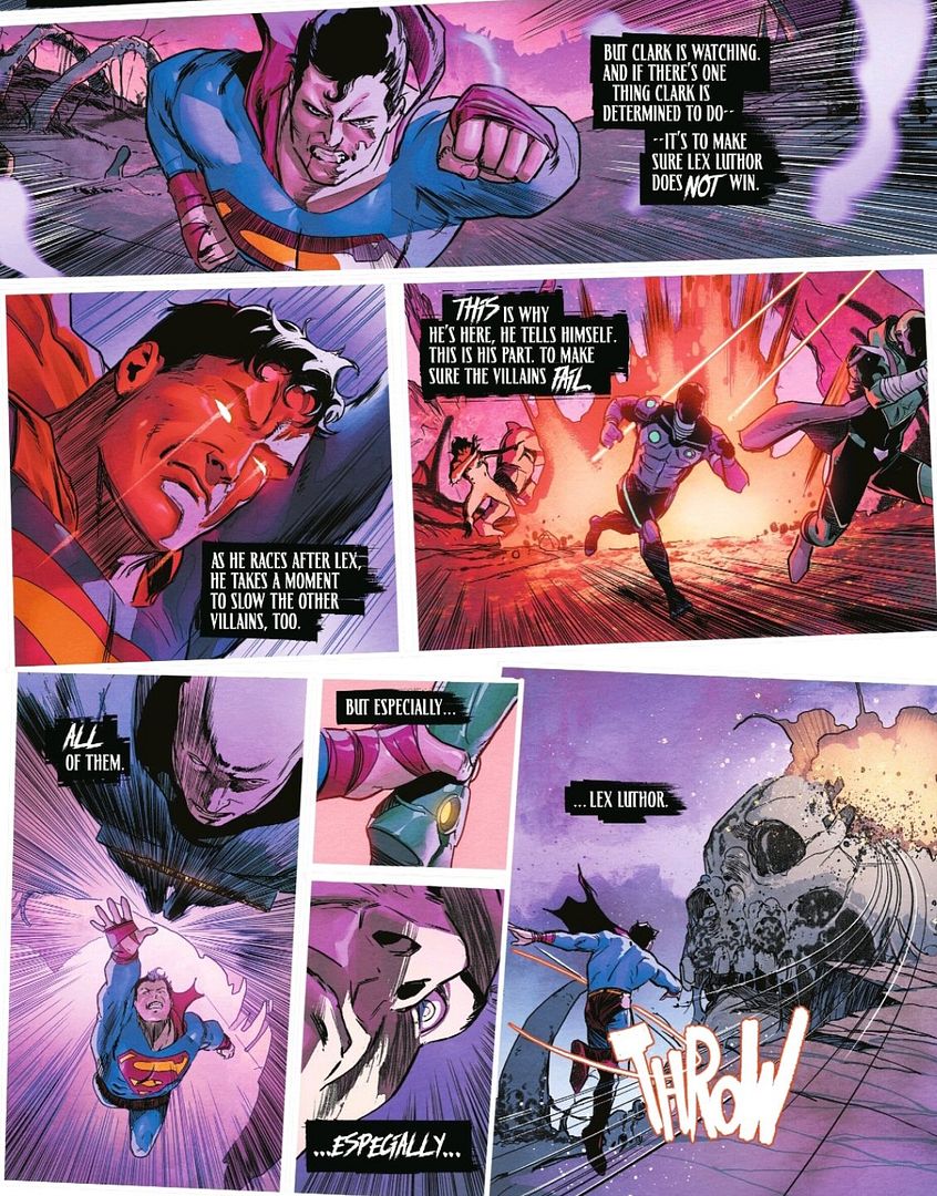 As context for this event, the primal energies of all DC reality are known as Alpha and Omega – with Alpha the energy of creation and life, and Omega the energy of conquest and destruction. Omega exists in the heart of Apokolips – a sentient entity that previously chose Darkseid as its bearer. In a contest to convince the heart to crown one of them instead, each has been given a vision of what they could achieve if granted King Omega status. In one of the early rounds of the K.O. event, Superman (Clark) is resolved to stop his arch-nemesis Lex Luthor from winning.