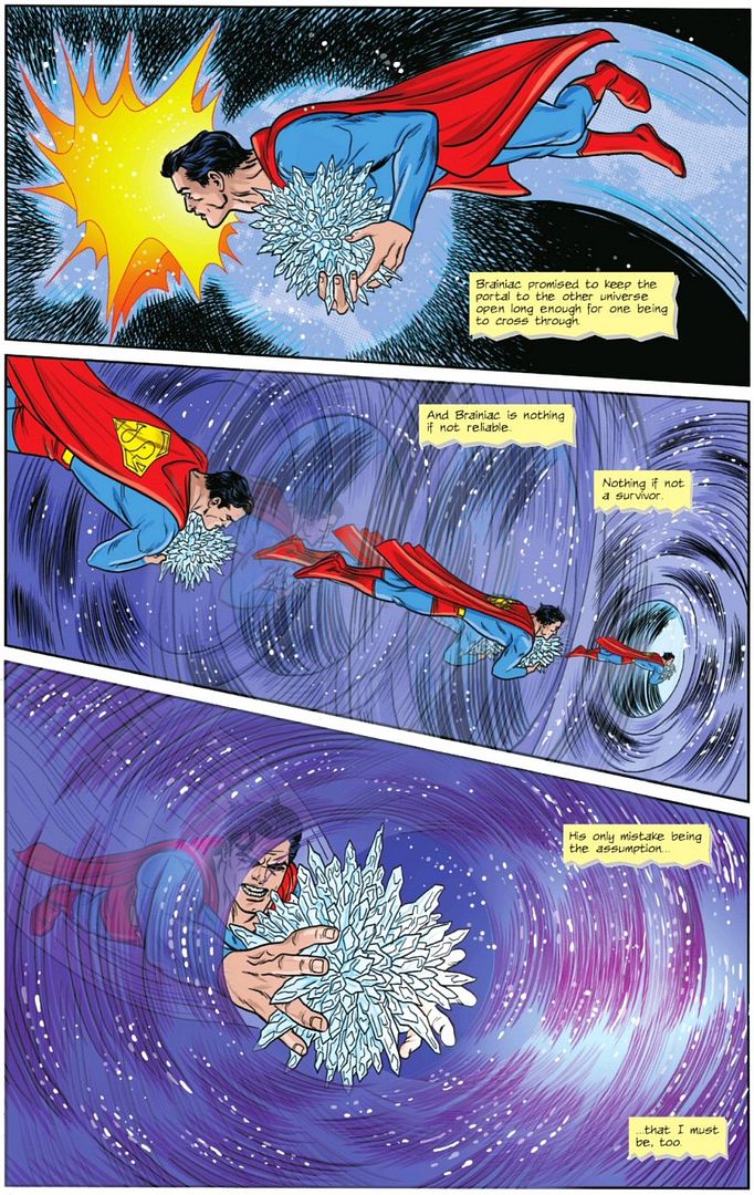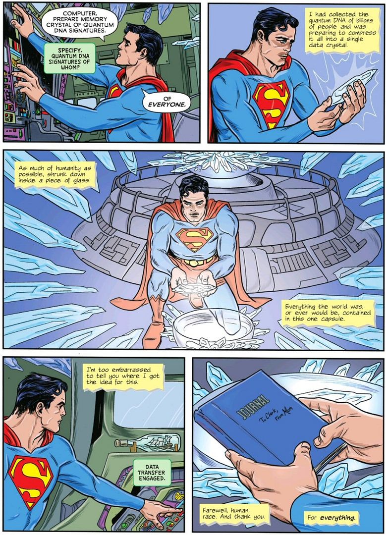 Clark has been given an opportunity by Braniac to survive the coming apocalypse of his world. But he has also learned that there is an Earth that will survive the coming Crisis – Earth-832654-Z – an Earth where humanity has killed itself off, but where a lone Superman still survives. And so, his creative virtue solution is interesting: