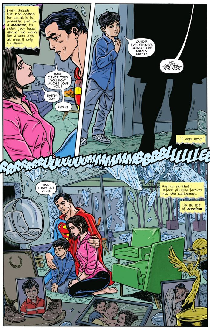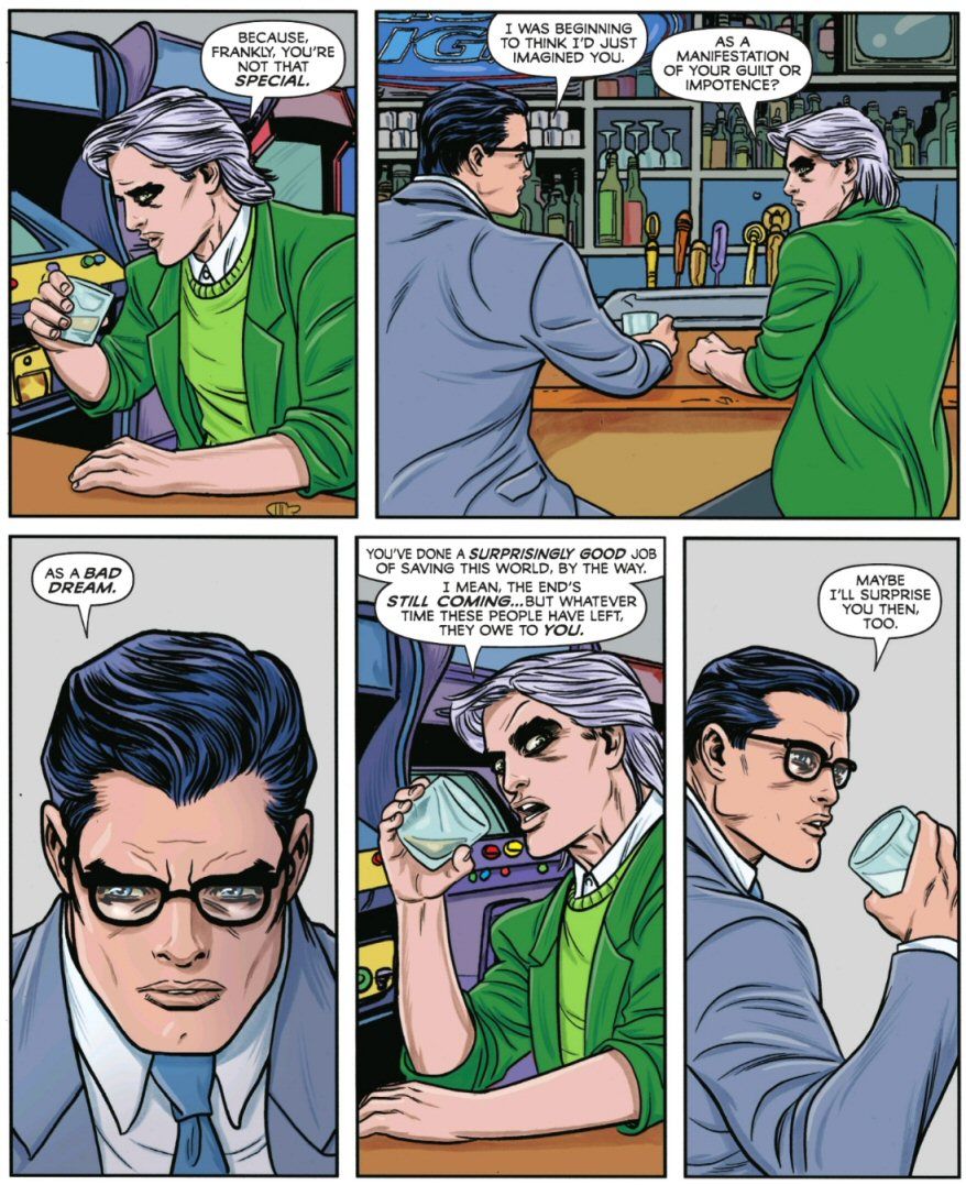 I also enjoyed the implied vanity of Lex in this series. Although Clark and Lois have both clearly aged, Lex is wearing a permanently youthful face mask. It’s a nice artistic touch!