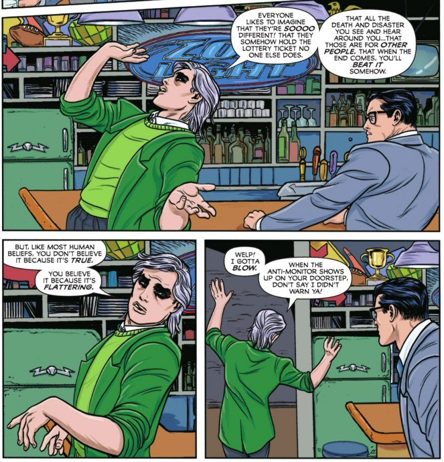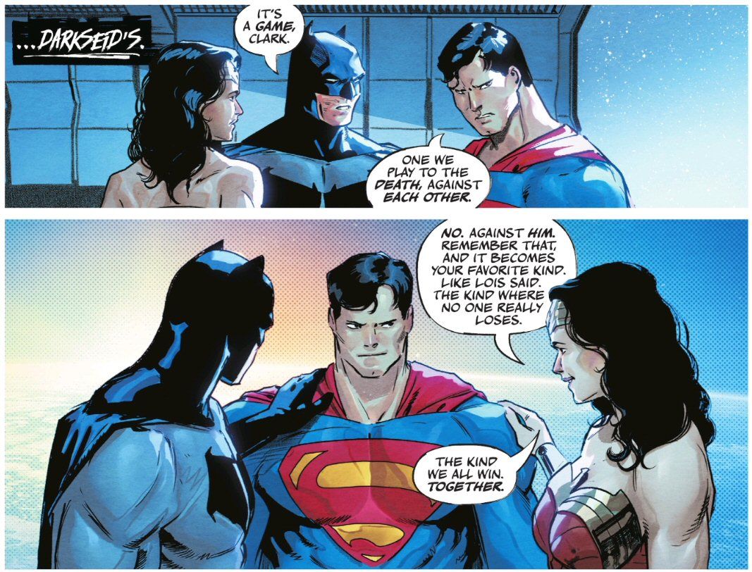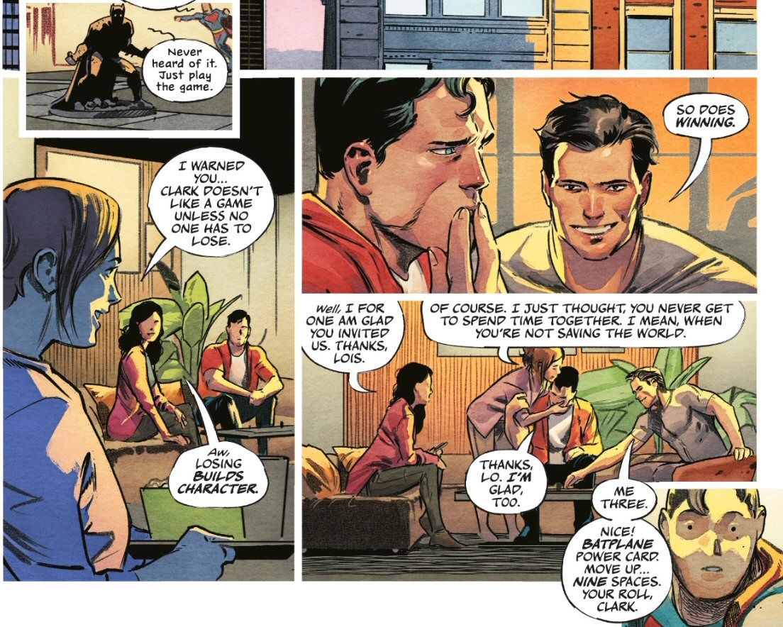 I find care ethics is increasingly common in modern comic books (check out my Glossary page for many examples). Note this philosophical view is something that Clark shares with Lois, as shown both in Williamson’s Superman Vol 6 run and in the DC K.O. game night sequences. For example, consider this scene following Bruce’s rather adamant consequentialist posture above (from issue #3, by Williamson and Xermanico):