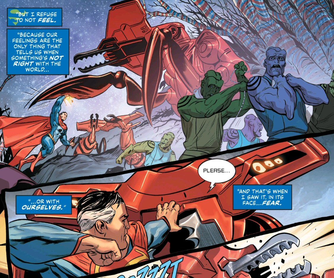 But probably the surest proof of the modern care ethics framing for Clark is his fateful decision in the final battle with Darkseid. From issue #5, by Snyder and Fernandez (with the heart narrating):