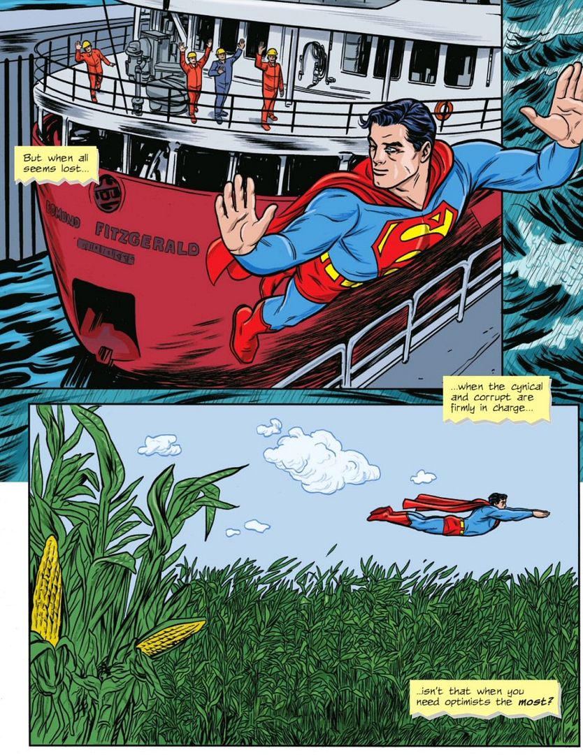 This hearkens back nicely to what Lois said to Clark in that Superman: Space Age series by Mark Russell that I presented earlier – it takes a village to change the world. And so for Clark, he chooses to restore the original universe, not his utopian version: