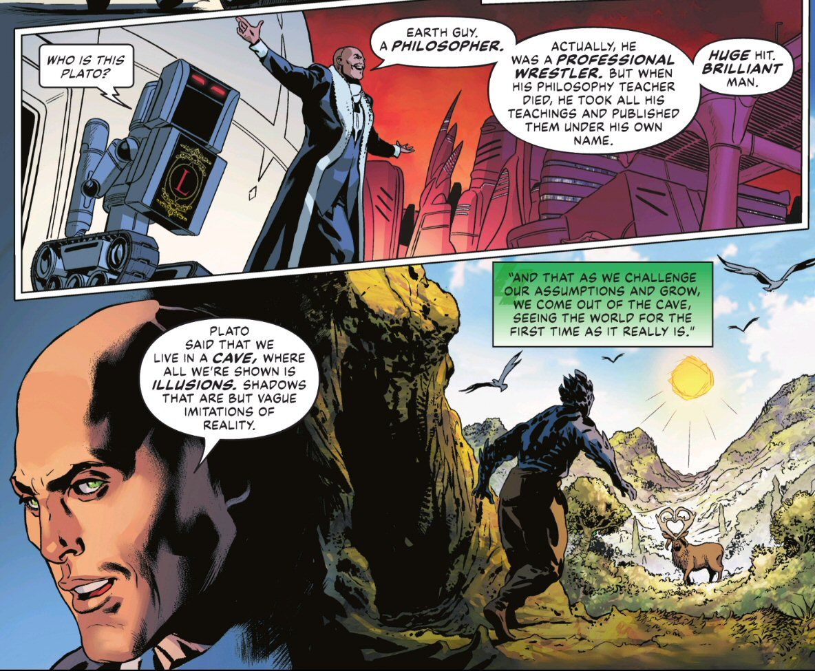 I literally burst out laughing when I read those opening panels – very much on point to Lex’s distorted world view, but not altogether inaccurate. Plato was indeed Socrates‘ most successful student. He was previously more interested in gymnastics and poetry, but Socrates got him onto the path of studying philosophy. He eventually succeeded Socrates as the leader of his school, which Plato then focused on his three principal interests: philosophy, mathematics, and gymnastics. 🙂