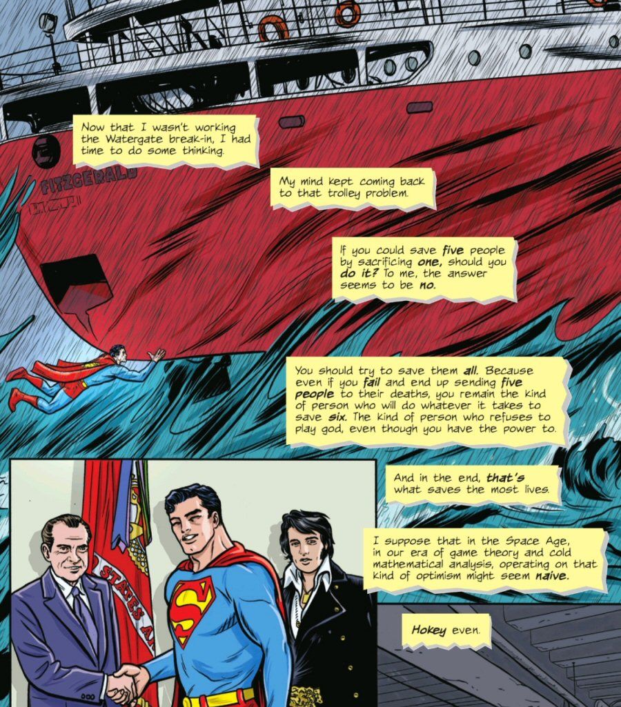 Through stand-ins or alternate universes, many writers could thus treat him as a moral philosophy experiment. Taken together, a consolidated view seems to be that when a being of Superman’s power fully embraces consequentialism, he eventually turns into a fascist dictator (although a number of the above examples step back before falling into that abyss). Generally, it seems like most were arguing that deontological or virtue-based constraints were the correct choice in preventing a consequentialist catastrophe. However I would add that this generally requires virtue ethics’ constant vigilance and active practice (i.e., it is not some passive innate goodness). For those looking to pursue this idea further, a thoughtful examination of the attempts to “deconstruct” Superman’s moral character was published by Comic Club Live last fall (coinciding with the latest Superman film). It’s worth a read.