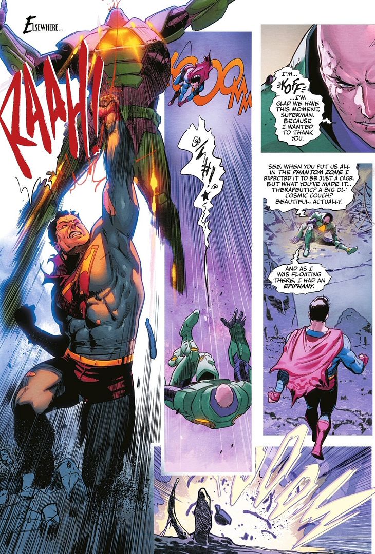 Note that prior to this event, Lex had been imprisoned in a reconfigured Phantom Zone – which as Lex himself admits was redesigned by Superman to be far more therapeutic than punitive. Although you might argue that is a sense of restorative justice in Superman, I think it hews more closely to Superman’s innate sense of virtue ethics – trying to the help the villains be better.