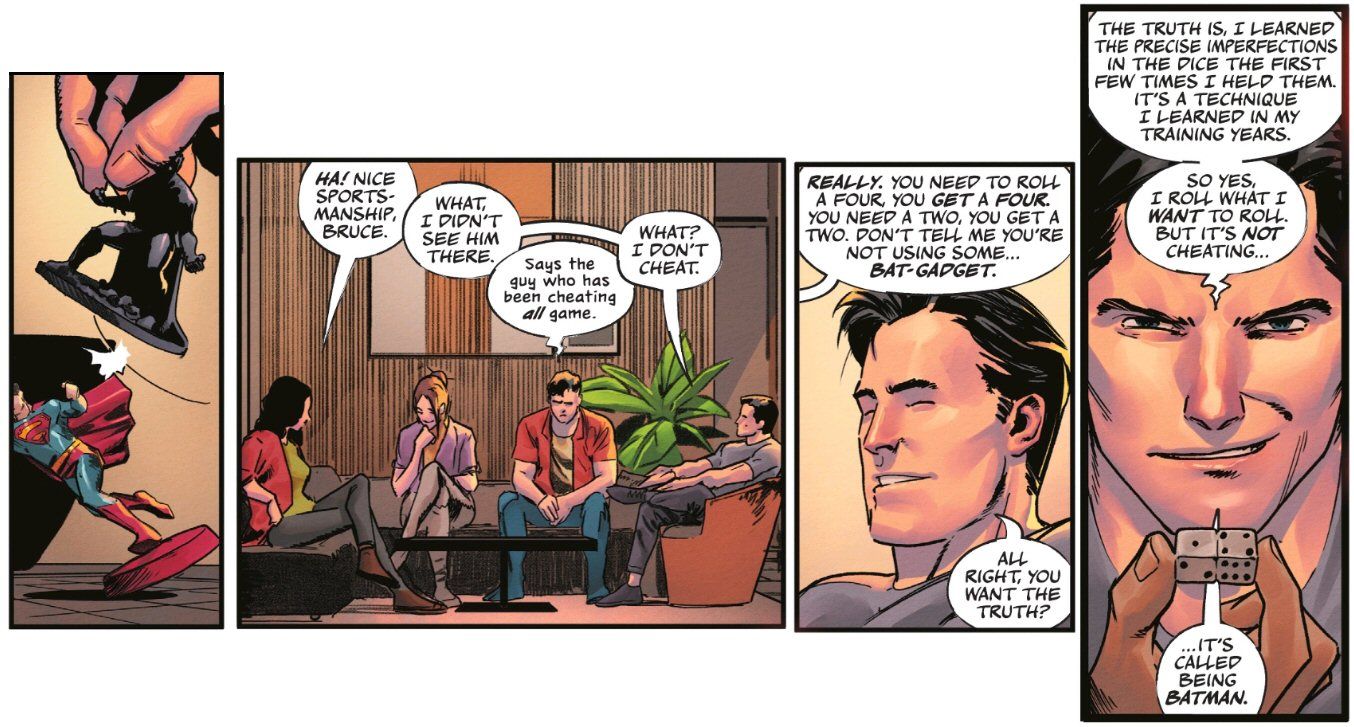 As an aside, these interludes also capture the other characters well – such as this scene with the very consequentialist Bruce explaining how his abilities aren’t really cheating. From issue #4: