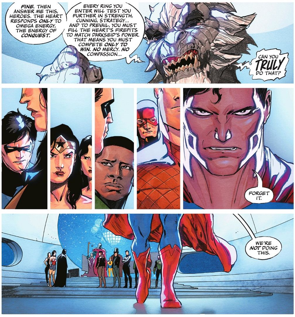 Getting back to the DC K.O event (and those pages from issue #2 introduced above), Clark was initially reticent to agree to the heroes’ plan to attempt to restart the heart of Apokolips and have it crown a new King Omega from among them. From issue #1, by Snyder and Fernandez: