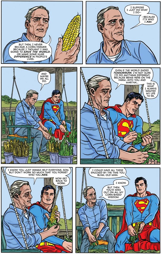 Again, Clark’s father is alive through most of this series (as with many later origin reboots), and there are several scenes where he imparts his virtue ethics perspective: