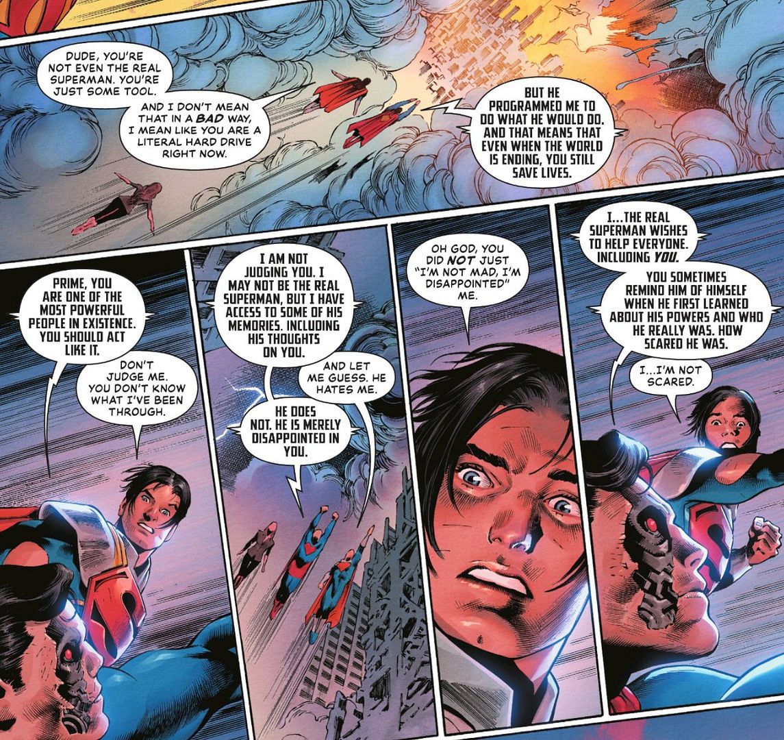 From Superman Vol 6, issue #34 (2026), where Prime is talking with a Superman robot copy that he revived to help him battle Darkseid’s forces (by Williamson with art by Eddy Barrows and Eber Ferreira):